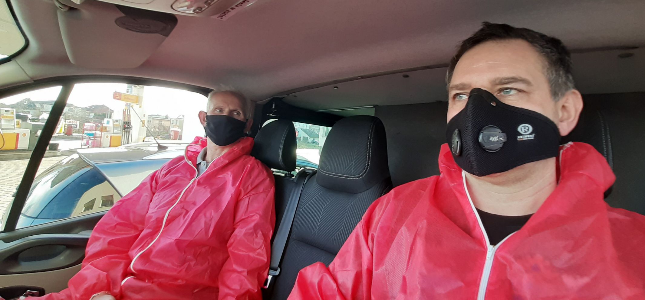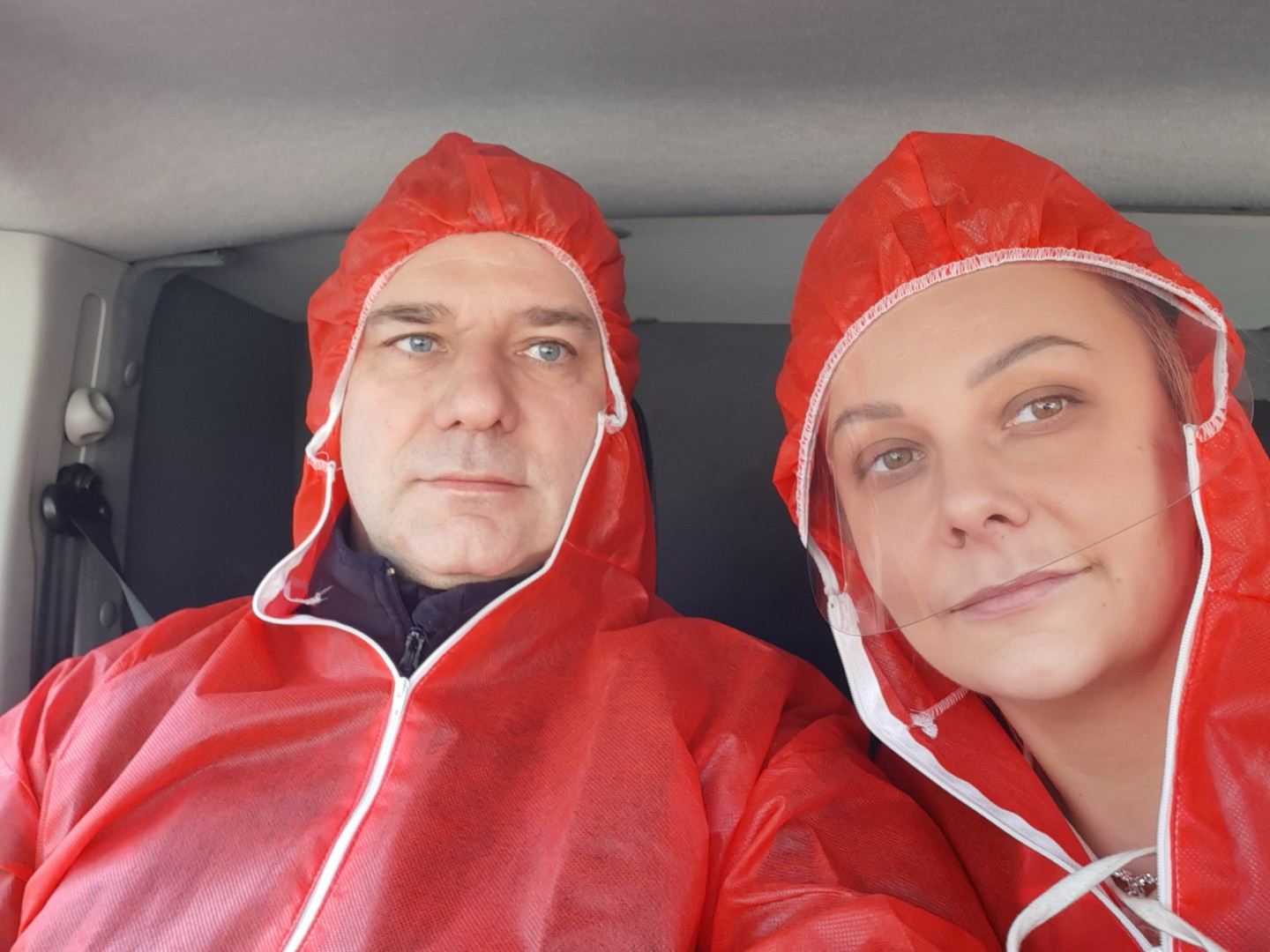 samochód transportujący oraz personel odpowiednio zabezpieczony w środki ochrony